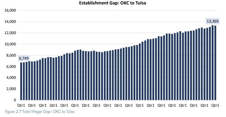 As social and economic activity continues to concentrate in the state’s population centers of Oklahoma City and Tulsa, the economic gap between urban and rural areas widens. But just as true, although slightly less obvious, is that Oklahoma City consistently experiences faster rates of growth than Tulsa, and the gap between Oklahoma City and Tulsa widens as well.